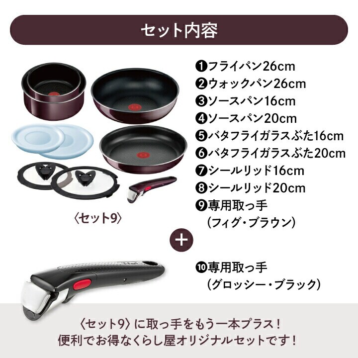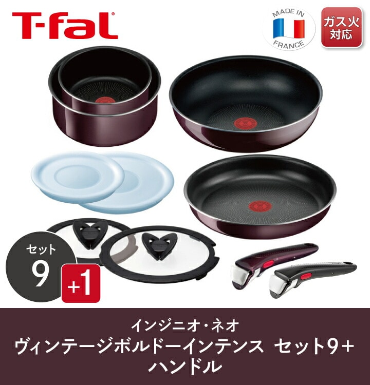 【くらし屋オリジナル10点セット】ティファール ガス火専用 インジニオ・ネオ ヴィンテージボルドー・インテンス セット9 L43991+ 専用取っ手 グロッシー・ブラック L98634 鍋 フライパンセット ガス 直火 専用 取っ手の取れる 取っ手2本 ギフト T-fal