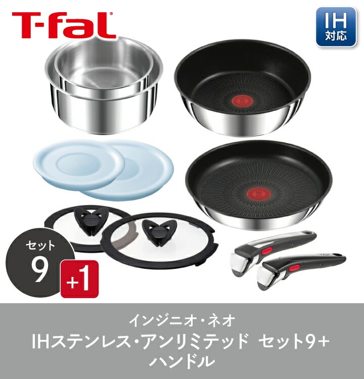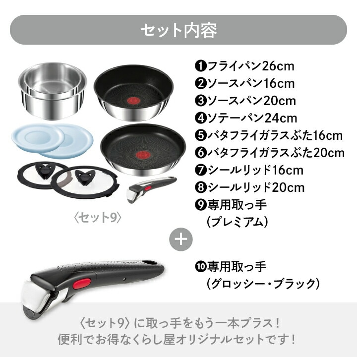 【くらし屋オリジナル10点セット】ティファール ガス・IH対応 インジニオ・ネオ IHステンレス・アンリミテッド セット9 L97090 + 専用取っ手 グロッシー・ブラック L98634 鍋 フライパンセット IH対応 ガス火 直火 取っ手の取れる 一式 ギフト T-fal