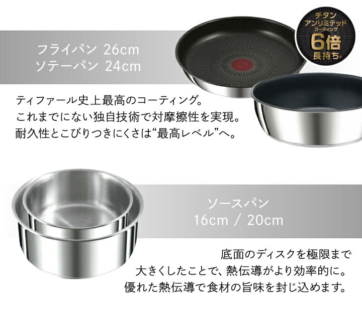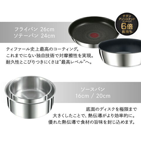 ●くらし屋オリジナルのお得なセット! ハンドルが2本セットになっているので、同時調理の際に 付け替える手間が省けてとっても便利です。 ●ティファール史上最高峰の耐久性を実現した 「チタン・アンリミテッド コーティング」で、 使い始めのこびりつきにくさが長く続きます。 ※ソースパンにはコーティング(ふっ素樹脂加工)を施しておりません。 ●上質なステンレスの質感がキッチンをスタイリッシュに。 |
