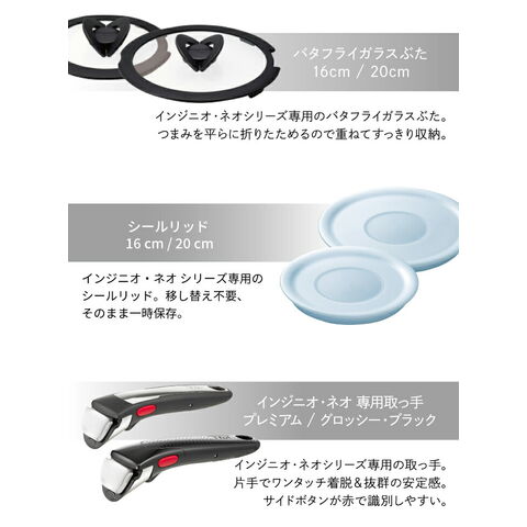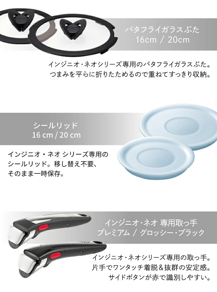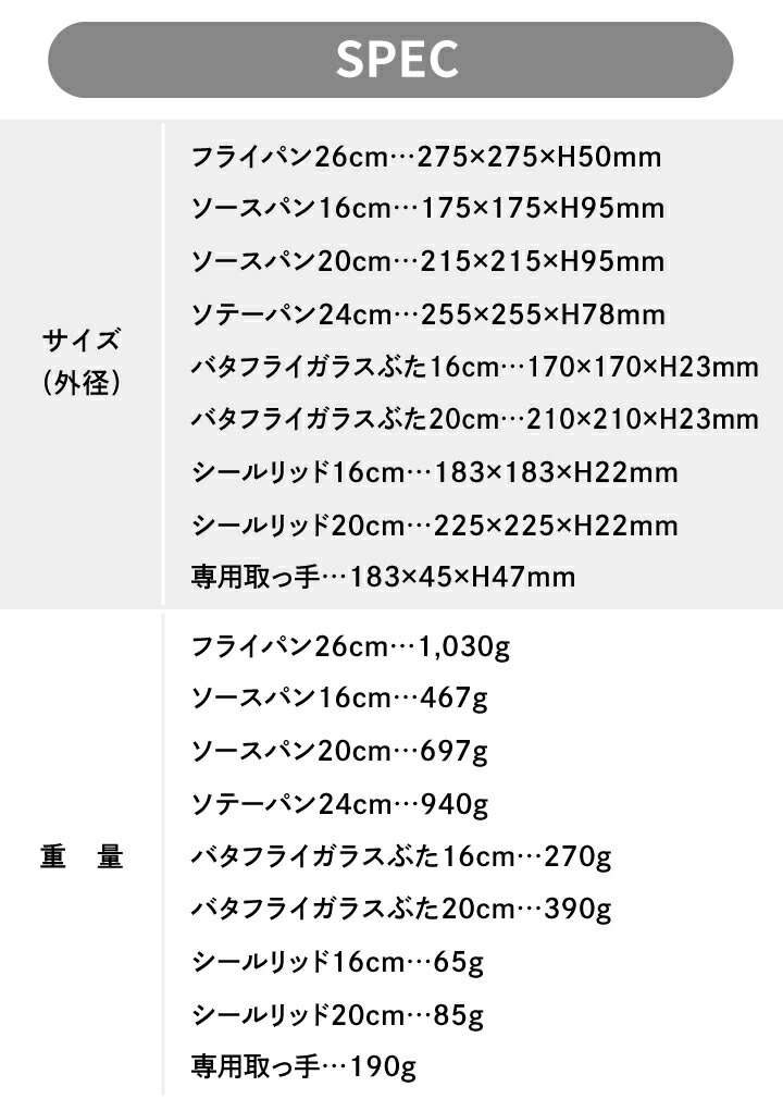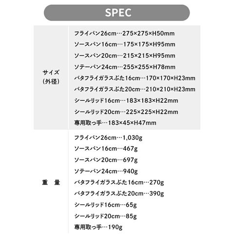 ・フライパン 26cm(チタン・アンリミテッド コーティング)…1個 ・ソースパン 16cm…1個 ・ソースパン 20cm…1個 ・ソテーパン 24cm(チタン・アンリミテッド コーティング)…1個 ・バタフライガラスぶた 16cm…1個 ・バタフライガラスぶた 20cm…1個 ・シールリッド 16cm…1個 ・シールリッド 20cm…1個 ・専用取っ手(プレミアム)…1本 ・専用取っ手(グロッシー・ブラック)…1本 |