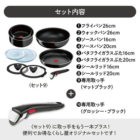 【くらし屋オリジナル10点セット】ティファール ガス火専用 インジニオ・ネオ ハードチタニウム・インテンス セット9 L43891+ 専用取っ手 グロッシー・ブラック L98634鍋 フライパンセット 一式 ガス 直火 専用 取っ手の取れる 取っ手2本 ギフト T-fal