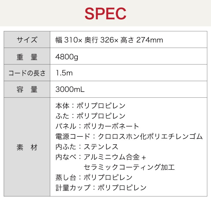 発酵・ベイクでパンまで焼けるマルチな電気圧力鍋! 朝食から夜のごちそうまで、おまかせでもっとラクに! ●12種類の調理モード 「圧力調理」「蒸す」「無水調理」「ごはん」 「玄米」「炒め」「発酵調理」「ベイク」 「スープ」「煮る」「ゆでる」「煮つめ仕上げ」の調理モードを搭載。 時短調理から本格的な料理まで、より幅広い料理を おいしく作れるようになりました。 ●スマート予約調理で外出中もおまかせ 予約開始後すぐに調理を行い、最適な温度を保ちながら 最後に仕上げ加熱を行う「スマート予約調理プログラム」。 お出かけ前に準備しておくと、帰宅時にアツアツの出来立てが食べられます。 最大12時間まで保温可能。 ●さらに使いやすく! ワンプッシュ&ほったらかしでOK、「かんたん圧力排出ボタン」。 キッチンカウンターなどに設置した際にも見やすく操作もしやすいよう、 角度が付いたパネルになっています。 持ち運びしやすい取っ手付きデザインなので、 キッチンでの移動も安心です。 ● お手入れも簡単に! 汚れが落としやすい「セラミックコーティングの内なべ」は 食洗機にも対応。 パーツが少ない「シンプル設計のフタ」。 鍋に付いた料理のにおいを除去できる「スチーム洗浄機能」。 ●2~4人分の調理ができる3Lサイズで、キッチンに置きやすい コンパクト設計。 ●専用の蒸し台、炊飯カップ、専用レシピブック付き(55レシピ) |