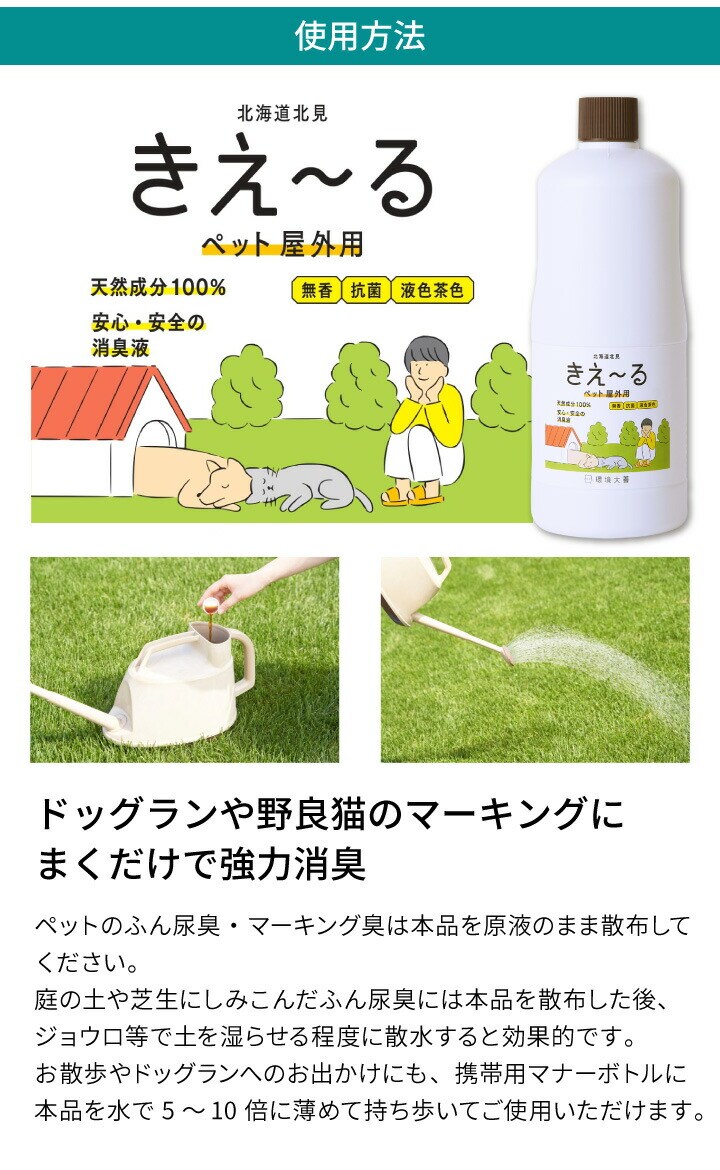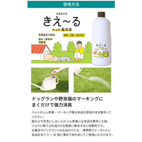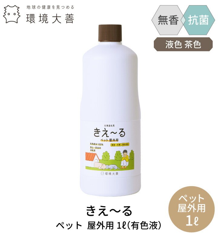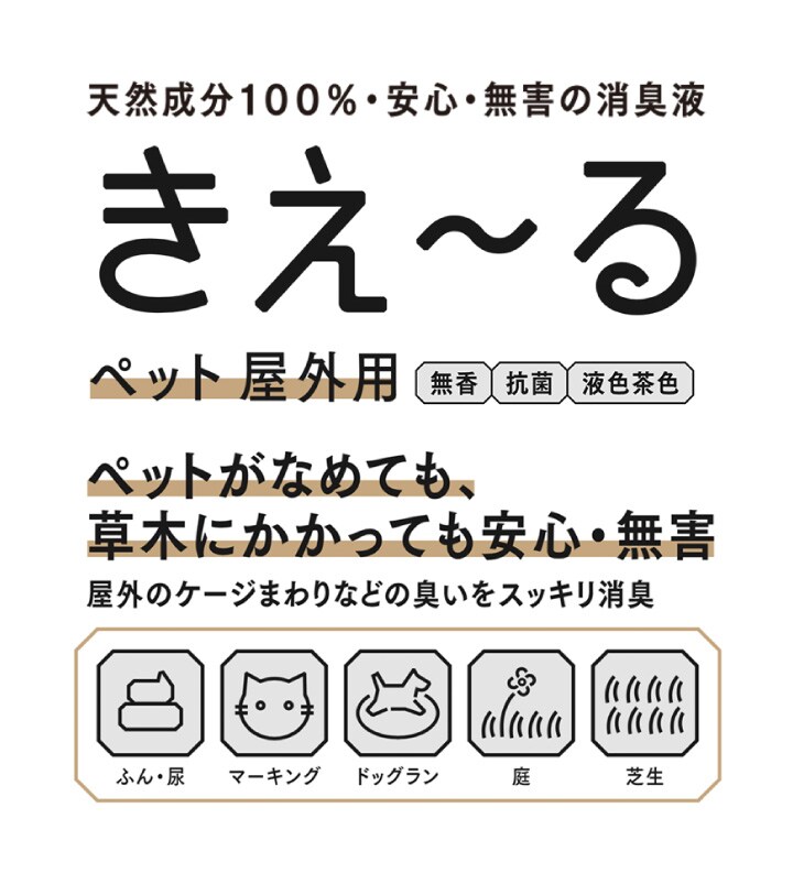きえーる 1リットル 1L 1リットル 消臭 消臭力 ペット用 犬 イヌ 猫 ネコ におい ニオイ 臭 糞尿 ふん尿 糞 ふん 尿 おしっこ マーキング アンモニア アンモニア臭 ケージ ケージまわり サークル サークルまわり 犬小屋 腐敗臭 舐めても なめても かかっても 安心 大丈夫 屋外用 外 庭 芝生 ドッグラン 天然芝 人工芝 土 草 木 花 天然成分 100% バイオ バイオ消臭液 液 色 茶色 有色 抗菌効果 無香料 清潔 衛生 きれい キレイ そうじ 掃除 清掃 サスティナブル 環境 環境にいい 環境にやさしい made in Japan ダイゼン