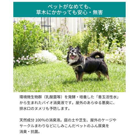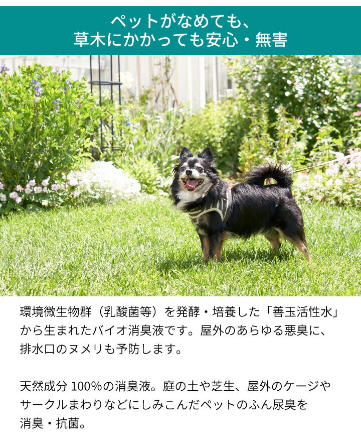庭の土や芝生、屋外のケージやサークルまわりなどにしみこんだペットのふん尿臭を消臭し、