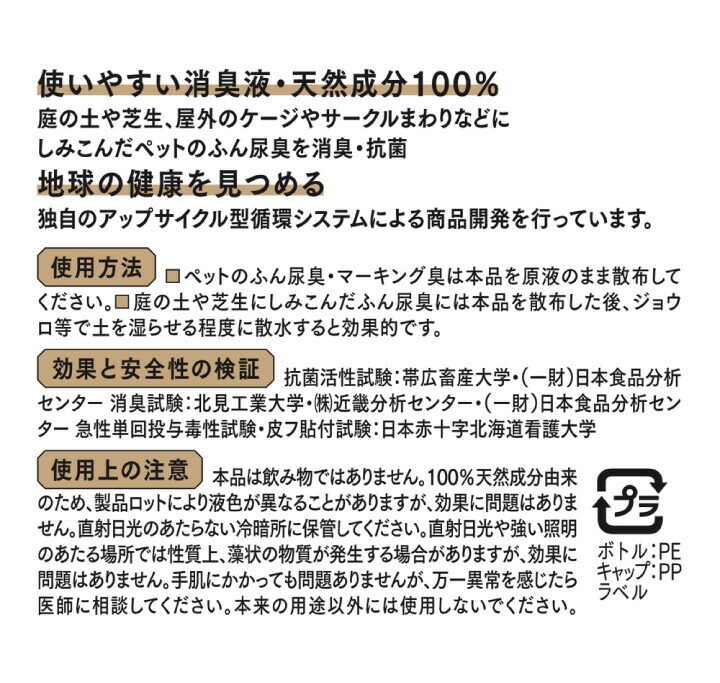 屋外のペットのふん尿臭やケージまわりの臭いをスッキリ消臭。