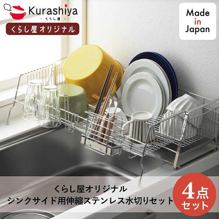 【くらし屋オリジナル】燕三条製 シンクサイド用 伸縮ステンレス水切り 4点セット 1306278 ヨシカワ 日本製 拡張 グラスホルダー 箸立て 包丁スタンド ステンレス製 水切り 水切りカゴ 別注 同梱不可