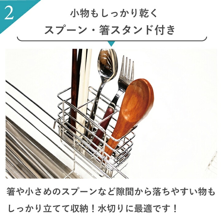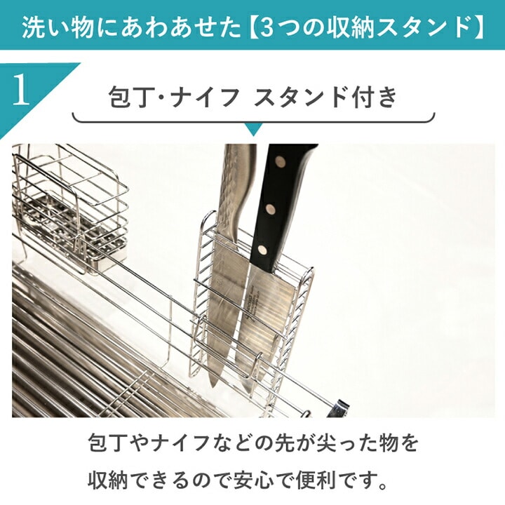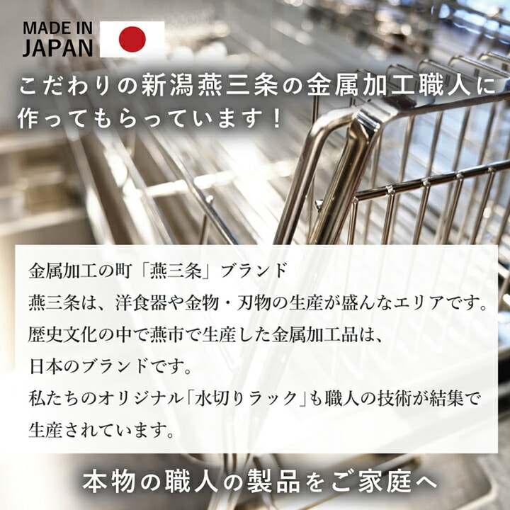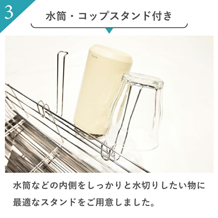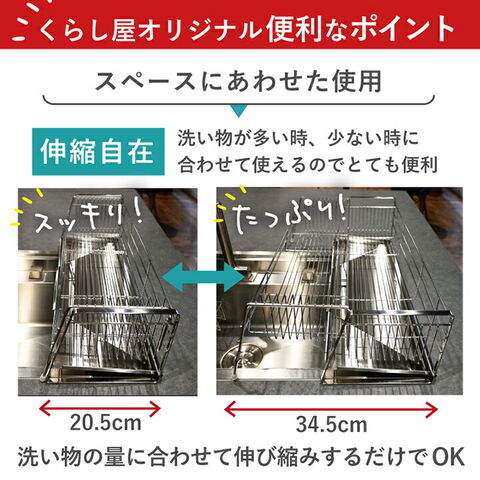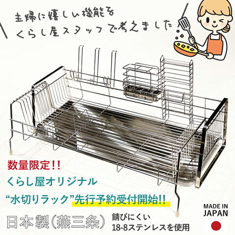 ●たくさんの生活雑貨を見てきたくらし屋スタッフが 本当に使いやすい、便利な水切りカゴを作りました! 日々の家事、積もるストレスを解消します! ●「洗い物が多い時、ラックに乗り切らない…」 ・ラックを広げるだけで収納力がぐんとUP! 多い時も少ない時もこれがあれば大丈夫! ●「包丁の刃で食器を傷つけたくない…」 「お箸などのカトラリーが下に埋もれて不衛生…」 ・包丁スタンドと箸立てがセットになっているので 水切りが早く安全で衛生的! ●「毎日使うコップや水筒がラックを占領…」 ・水筒やコップの内側をしっかり水切できる、 少し斜めに角度が付いたグラスホルダーもセットに含まれています! ●ステンレスの隙間はこだわりの1cm! 空気の通りは邪魔せずに、細かい物も落ちにくくなり さらに頑丈さもUP! ●洗い物の水を集めて排水してくれる傾斜が付いたトレイ♪ ●燕三条産の丈夫でサビに強いオールステンレス製! |
