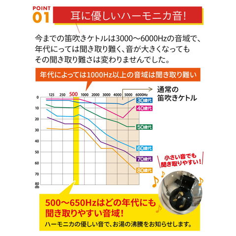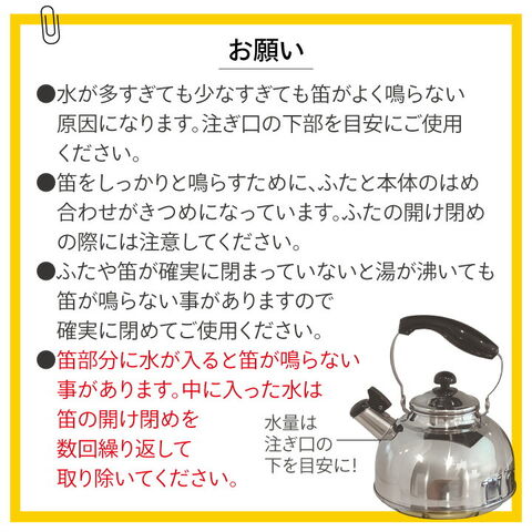 ●たくさんの生活雑貨を見てきたくらし屋スタッフが 笛吹ケトルを作りました! ●耳に優しいハーモニカの音色で、沸騰をお知らせします♪ ●従来の笛吹ケトルより、 どの年代の方にも聞き取りやすい音域になっています。 ●ガス、IHどちらにも対応しています。 ●燕三条産の丈夫でサビに強いオールステンレス製! |