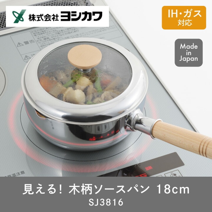 【期間限定 ふきんプレゼント中】見える!木柄ソースパン 18cm SJ3816 ヨシカワ IH対応 ガス火対応 中が見える ガラス蓋付き 片手鍋 鍋 両側 注ぎ口 ミルクパン 離乳食 計量 目安 取っ手付き 煮込み スープ ソース 日本製