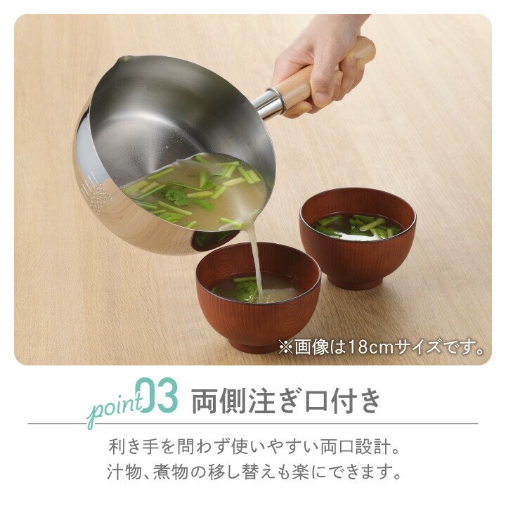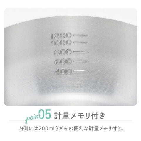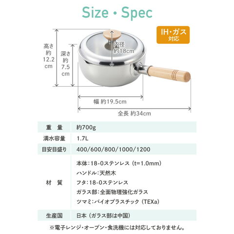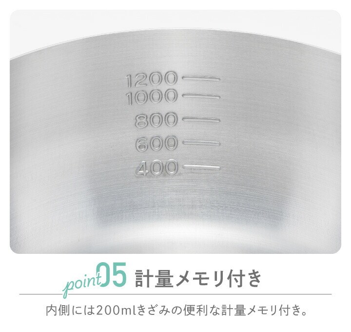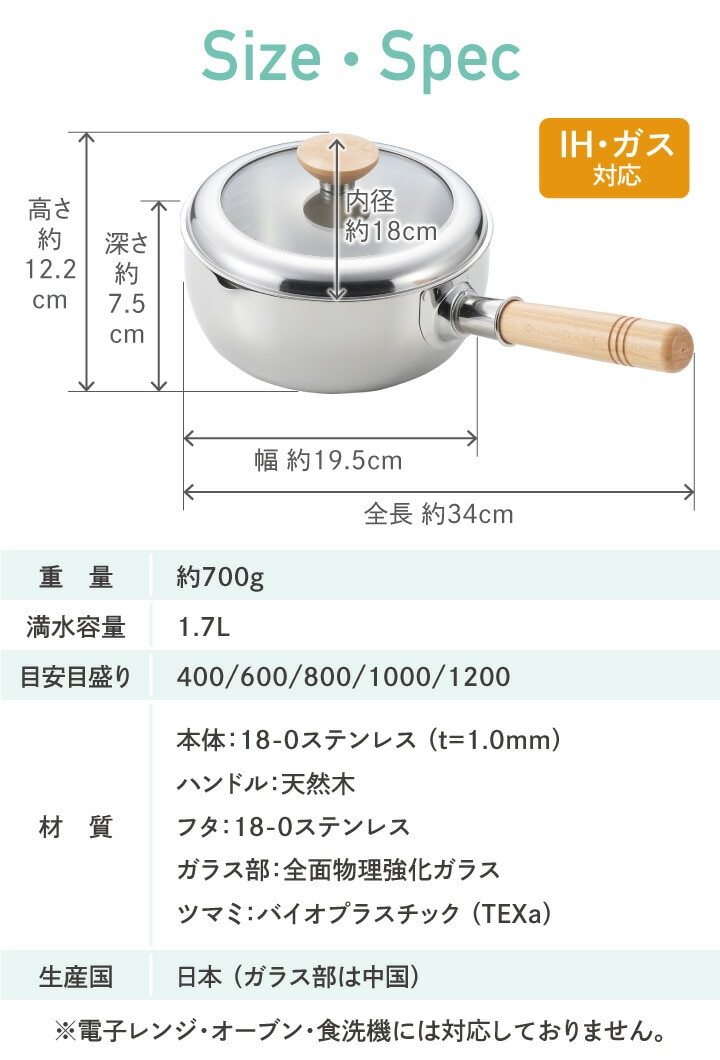 ●4~5人分のお味噌汁や野菜の下茹でにおすすめの18cmサイズ。 ●ふたを開けずに調理具合が分かる、便利なガラス蓋付き! 食材や調味料を入れるタイミングを見逃しません。 ●保温性が高いステンレス製なので、煮込み料理に最適。 色やニオイがつきにくく、お手入れもラクラク。 ●注ぎ口は両側についているので、利き手を問わず使いやすい! ●蓋のツマミはフラット形状なので、置いたときに転がらず安定して置けます。 ●内側には400ml~1200mlまで、200ml刻みの便利な目盛り付き。 |