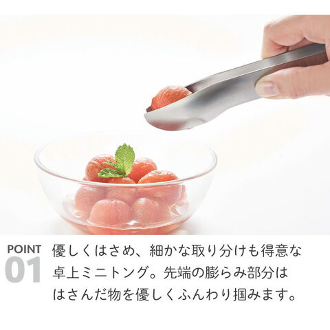 優しくはさめ、細かな取り分けも得意な卓上ミニトングです! ●先端の膨らみ部分ははさんだ物を優しくふんわり掴みます。 ●刃先がしっかり合うので、 細かな物や薄い物の取り分けも得意です。 ●上下持つ向きによって、すくい上げたり、 つまんだり、いろいろな用途で使えます。 ●先端が浮くので置く場所を気にせず手軽に扱えます。 ●臭いや色が付かないステンレス製。 ●耐食性が高く衛生的。 ●食洗機対応。 |