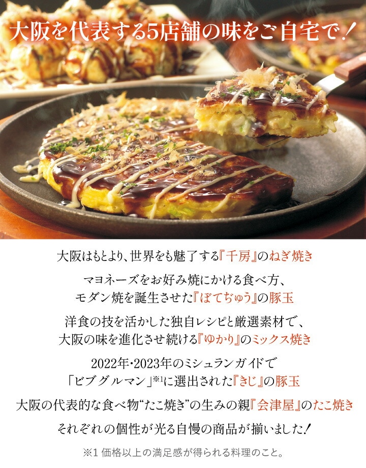 期間限定販売! 「くいだおれの街 大阪」の数あるおいしいお店の中から、 厳選したお店の味をご自宅にお届けします! ●牛すじコンニャクが入った、ねぎの風味豊かな「千房」のねぎ焼き。 ●職人さんが熱々の鉄板の上にお好み焼きの生地を"ぼてっ"と落として、 "ぢゅうっ"と焼きあげた「ぼてぢゅう」の豚玉。 ●昭和25年創業、厳選した原材料を匠の技で調理した老舗「ゆかり」の こだわりの味、特選ミックス焼き。 ●隠し味の青紫蘇(大葉)が奏でるさわやかな風味が食欲をそそる、 「きじ」の豚玉。 ●中はふんわりとろとろ。ダシの効いた「会津屋」の元祖たこやき。 ●「ホンマにうまい!」と言いたくなるようなおいしいグルメが、 ご自宅で、お手軽に楽しめます。 ●おつまみとしてもおかずとしても、ご家族みんなで楽しめる 大阪の味をご堪能下さい! |