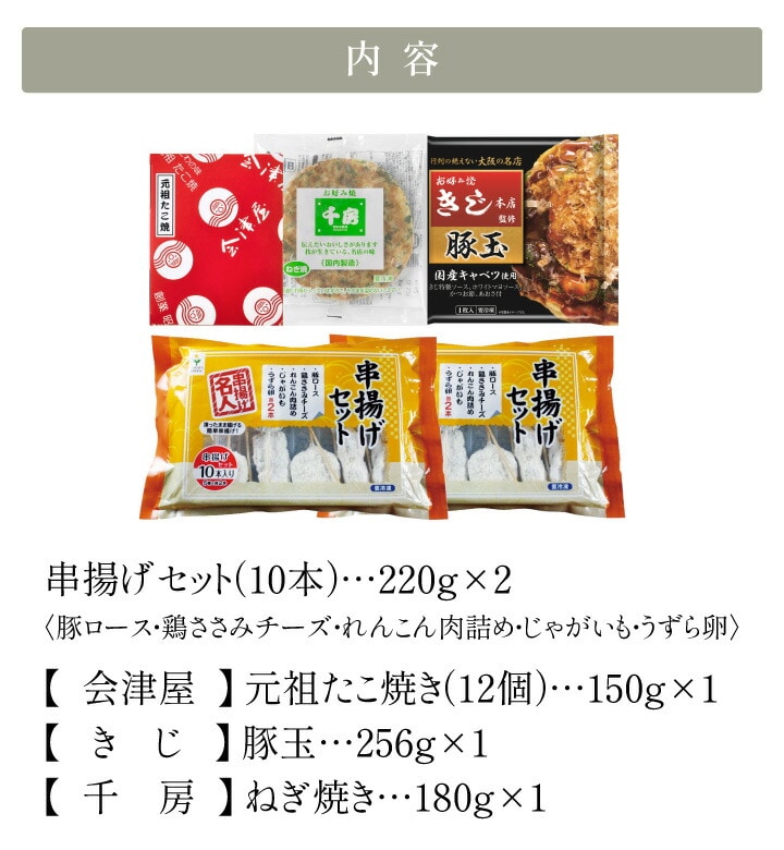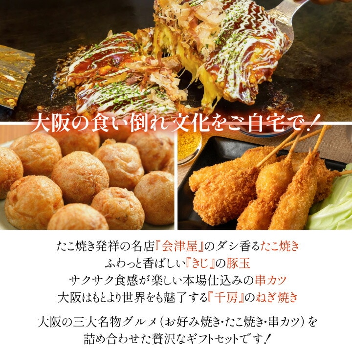ザ・大阪!粉もん&串カツ 食い倒れセット 5品 6607-50 きじ 会津屋 千房 大阪 名店 厳選 3店舗 食べ比べ お好み焼き たこ焼 串カツ お取り寄せ グルメ おいしい 本格 大阪グルメ 大阪の味 関西 冷凍 食品 同梱不可