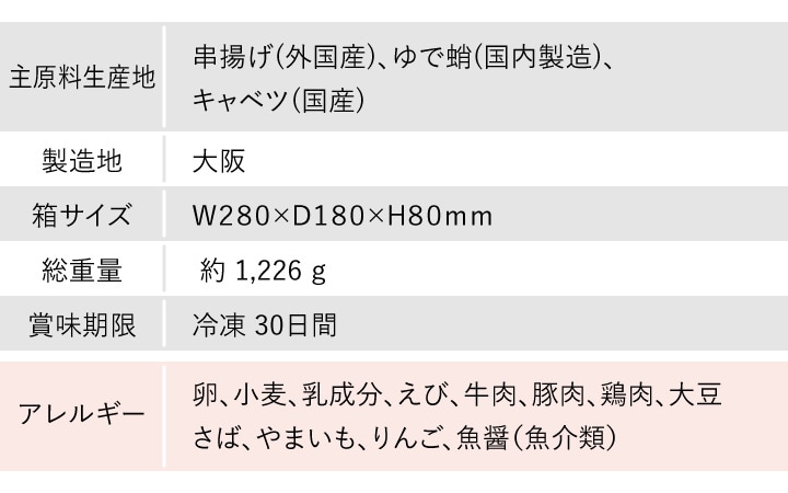 期間限定販売! 「くいだおれの街 大阪」の数あるおいしいお店の中から、 厳選したお店の味をご自宅にお届けします! ●中はふんわりとろとろ。ダシの効いた「会津屋」の元祖たこやき。 ●隠し味の青紫蘇(大葉)が奏でるさわやかな風味が食欲をそそる、 「きじ」の豚玉。 ●牛すじコンニャクが入った、ねぎの風味豊かな「千房」のねぎ焼き。 ●さらに、本場大阪仕込みの串カツが計20本(10本×2袋)も入っています! ●「ホンマにうまい!」と言いたくなるようなおいしいグルメが、 ご自宅で、お手軽に楽しめます。 ●おつまみとしてもおかずとしても、ご家族みんなで楽しめる 大阪の味をご堪能下さい! |