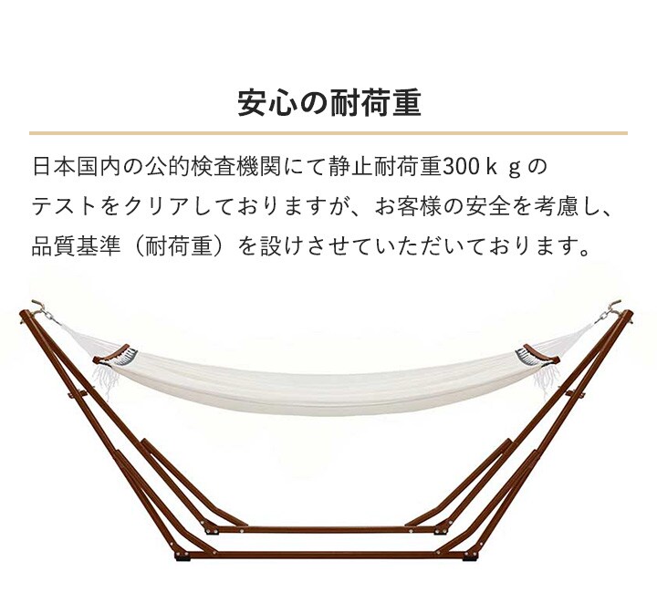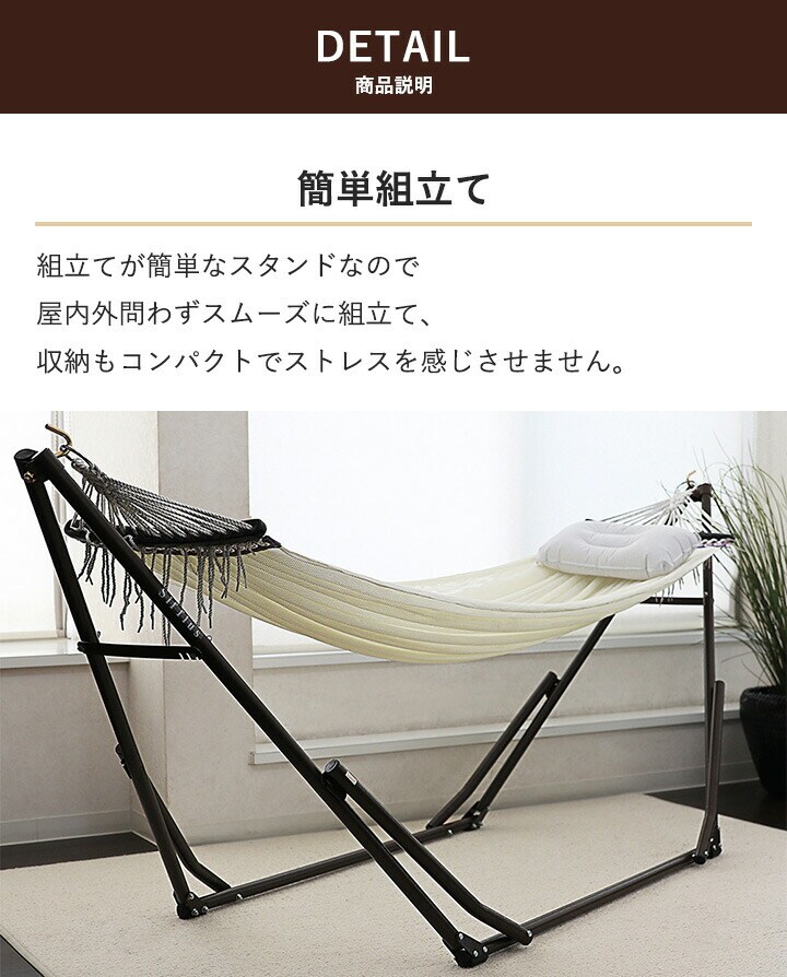 | 材 質 | ハンモック:ポリエステル、 スタンド:スチール、 枕:PVC、収納バッグ:ポリエステル |