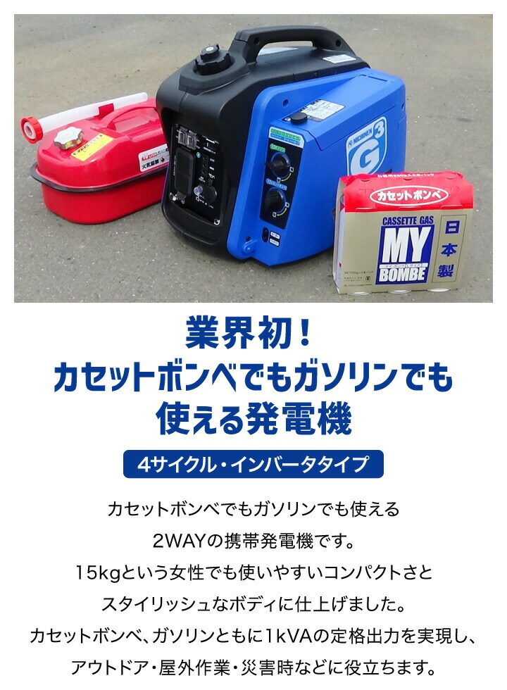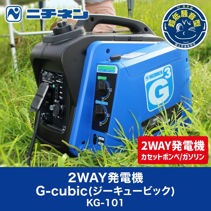 ジーキュービック KG-101 ニチネン 発電機 G-cubic ガソリン カセットボンベ 2WAY インバーター式 超低騒音型 15kg 軽量 防災 災害 備え 非常用 野外 イベント キャンプ 同梱不可
