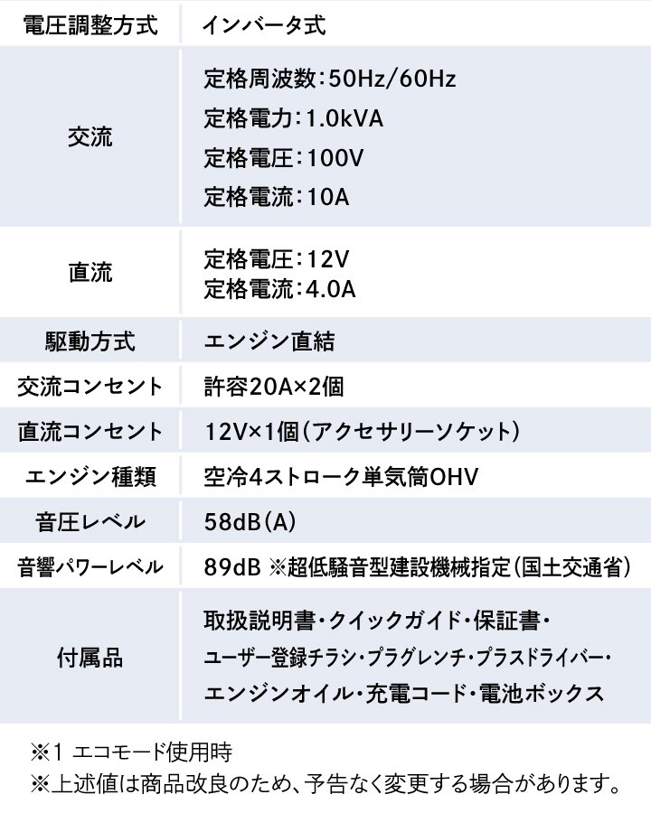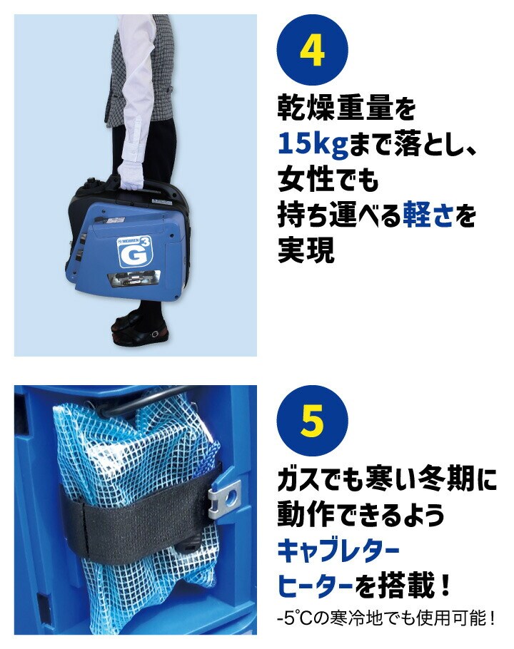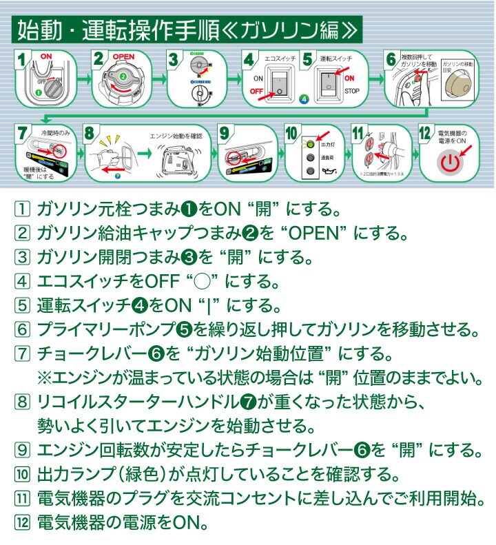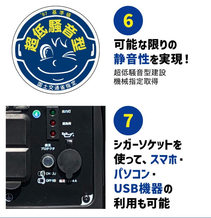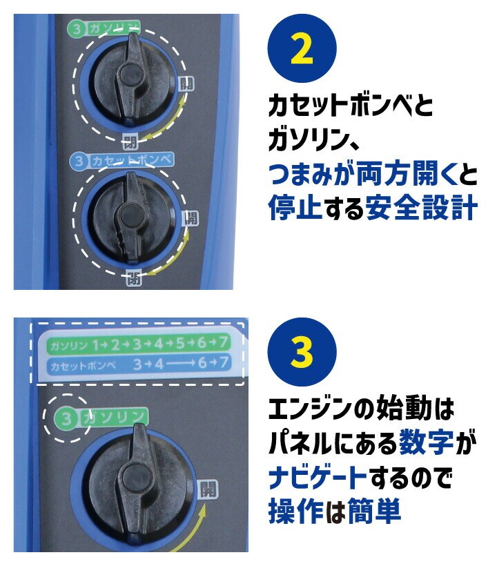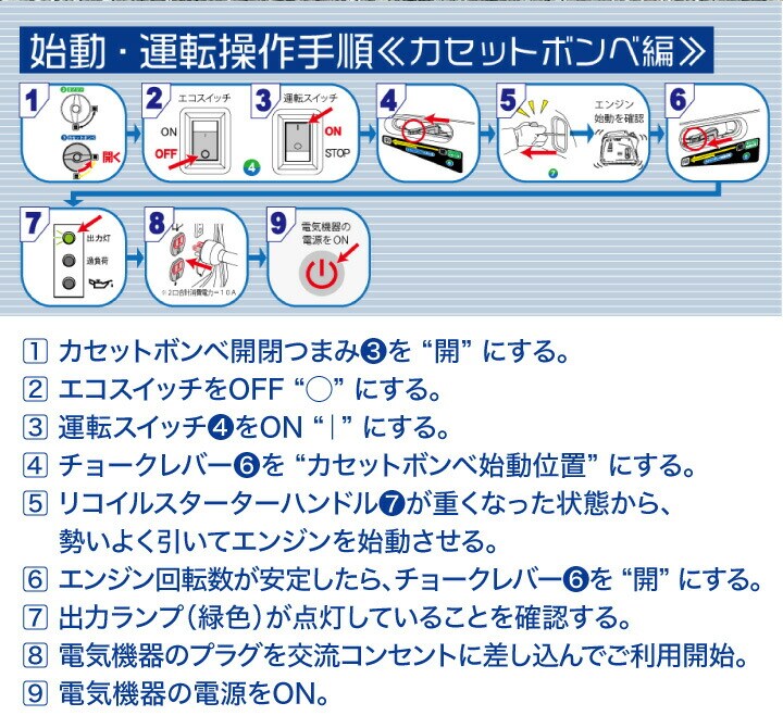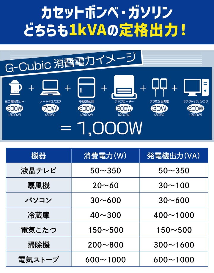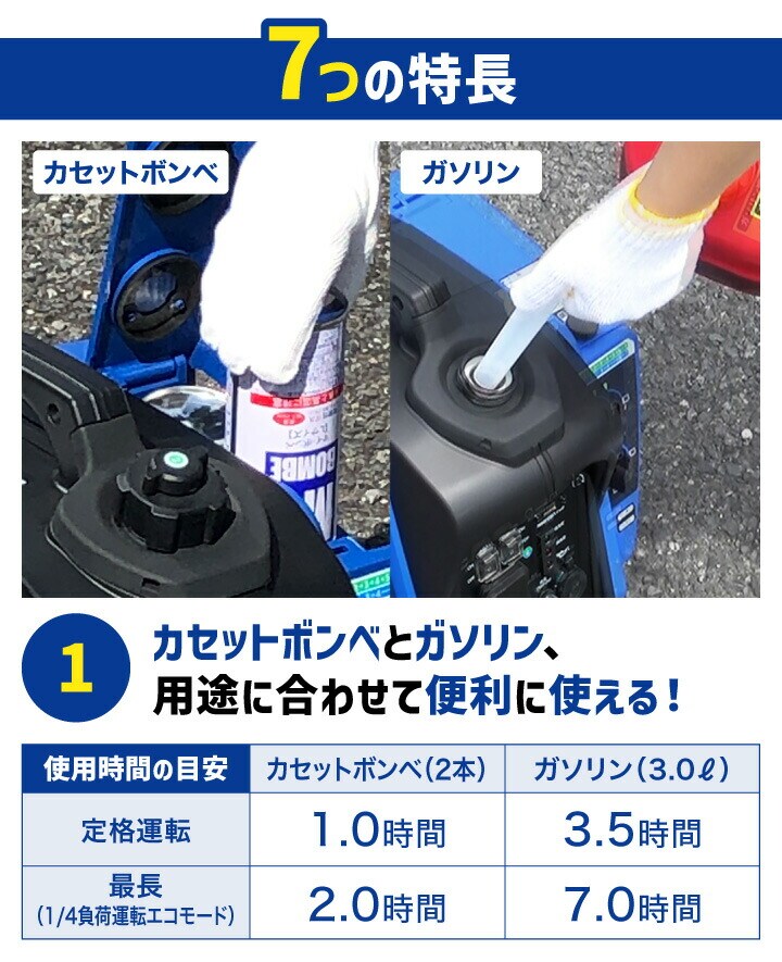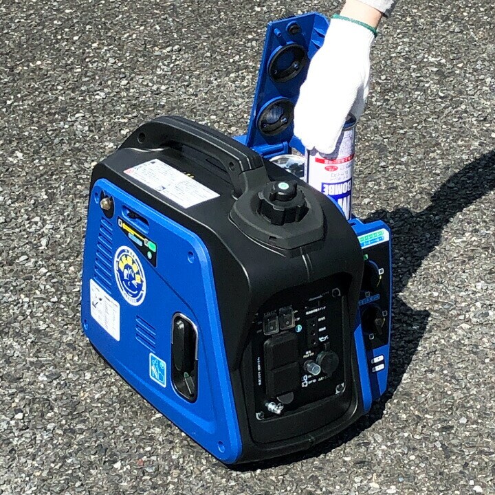 ●カセットボンベでもガソリンでも、用途に合わせて 便利に使える2WAYの携帯発電機。 どちらも1KVAの定格出力が可能! ●カセットボンベとガソリンの両方のつまみが開いたときは 発電が停止する安全設計になっています。 ●エンジンの始動方法はパネルにある数字がナビゲートしてくれるから、 初めて使う時や久しぶりに使う時でも、操作が簡単で分かりやすい。 ●乾燥重量は約15kgなので、女性でも持ち運べる軽さを実現。 コンパクトでスタイリッシュなボディ。 ●寒い冬期にガスでも動作できるよう、キャブレターヒーターを搭載! -5℃の寒冷地でも使用可能です。 ●可能な限りの静音性。国土交通省の超低騒音型建設機械指定取得。 ●シガーソケットを使って、スマートフォン・パソコン・USB機器の 利用も可能。 |