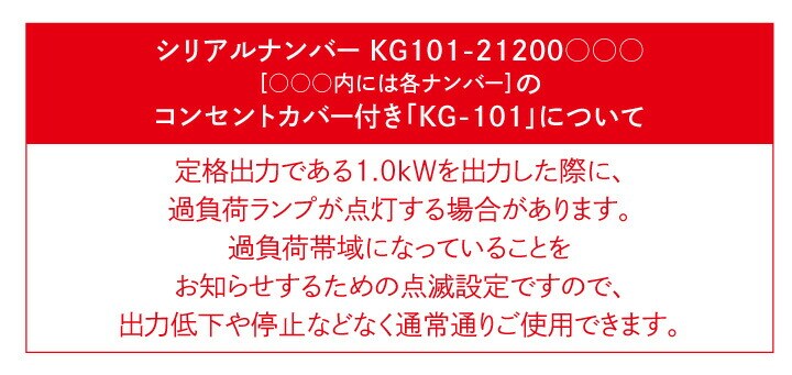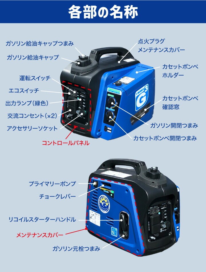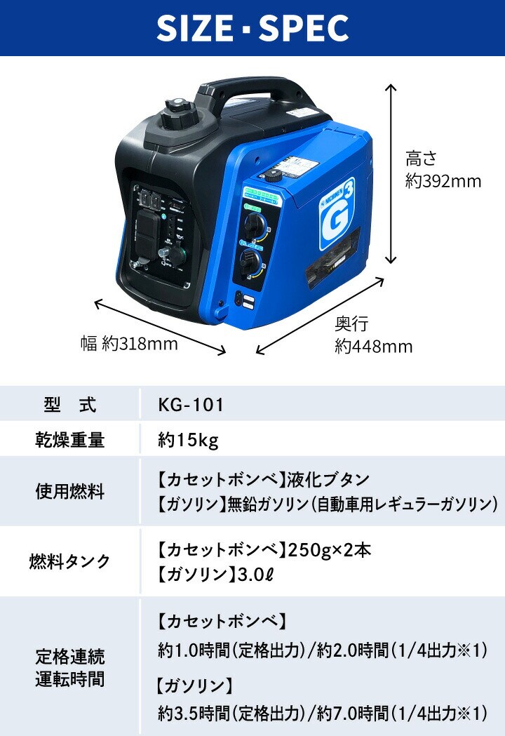 KG101 KG-101 KG101 発電機 発電機本体 携帯用発電機 ポータブル 電気 電源 家電 リコイルスターター 4ストローク 無鉛ガソリン レギュラーガソリン 自動車用レギュラーガソリン ボンベ CB缶 液化ブタン インバータータイプ インバーター 低騒音 低燃費 液晶テレビ 扇風機 冷蔵庫 こたつ 掃除機 ストーブ 電気ストーブ スマホ 同時 充電 ポット 電気ポット 電気ケトル ファンヒーター ヒーター 防災グッズ DIY 工具 電動ドライバー 屋外 バーベキュー 外遊び キャンプ イベント 祭り 非常用 非常時 災害時 簡単 安心 安全 軽い コンパクト 静か プラスドライバー付属 タンク容量 3L 3.0L 3L 3.0L 送料無料 同梱不可
