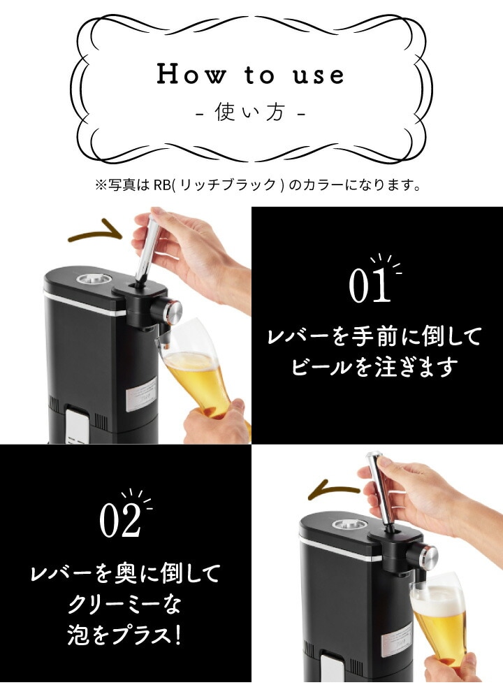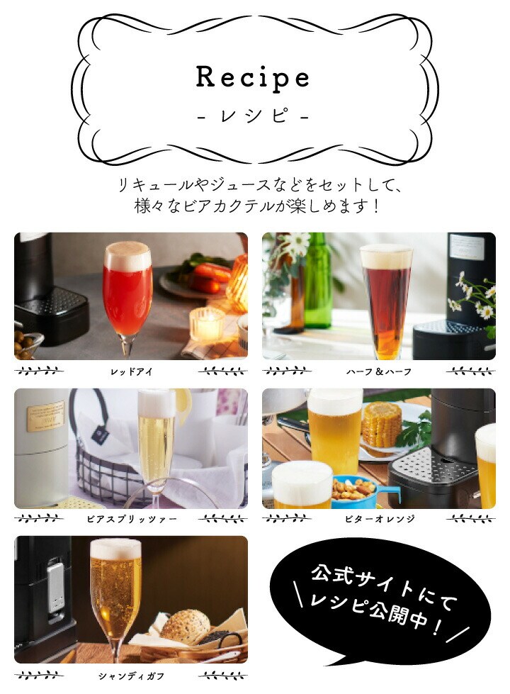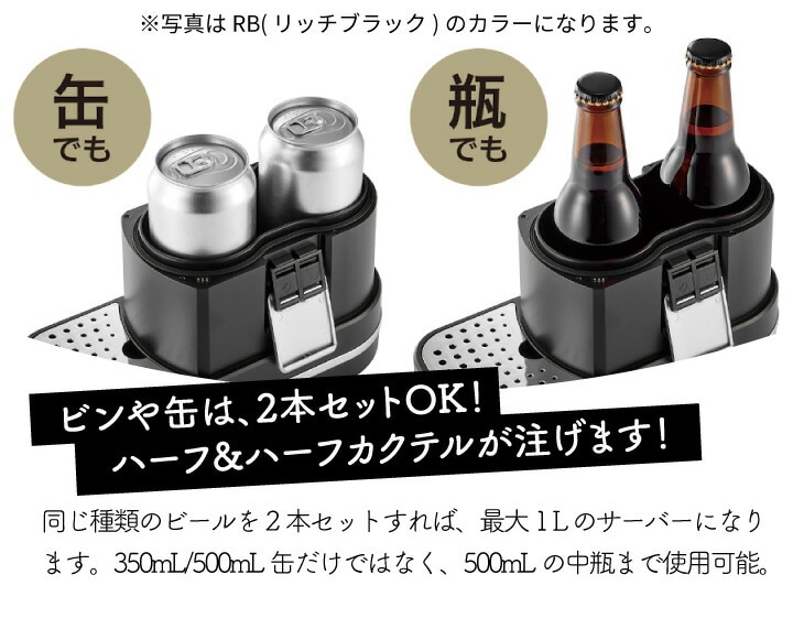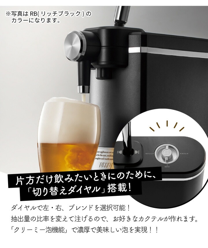 ●「クリーミー泡機能」で濃厚で美味しい泡を実現! 毎秒約4万回の超音波振動で作られる泡はとってもクリーミーです。 ●ビンや缶は2本セット可能! 美味しいハーフ&ハーフが簡単に作れます! 同じ種類のビールを2本セットすれば、最大1Lのサーバーになります。 ●片方だけ飲みたいときにのために「切り替えダイヤル」を搭載! レバーで液体と泡を切り替えられ、 ダイヤルでシングル左、右とブレンドを切り替えることができます。 ●350mL/500mLの缶、500mLまでの中瓶やペットボトルが使用できます。 ●リキュールやジュースをセットすれば、様々なビアカクテルも簡単に作れます! 抽出量の比率を変えて注げるので、お好きなカクテルが作れます。 ●ボトルの間の保冷剤により、冷蔵庫で冷やしたビールの冷たさが長持ちします。 ●棚や机の場所を取らない、スリムでコンパクトなデザイン。 ●場所を選ばない乾電池駆動。屋外にも持ち出そう! |