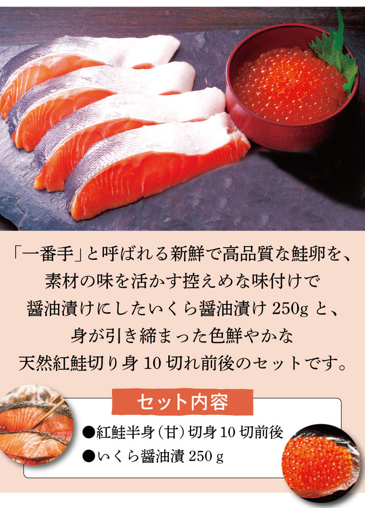 「紅鮭半身(甘)切り身10切れ前後(約1kg)」…紅鮭、食塩 「いくら醤油漬け250g」…鮭卵、米発酵調味料、還元水飴、食塩、魚醤、砂糖、鰹節エキス、植物蛋白加水分解物、醤油、昆布エキス、酵母エキス(原材料の一部に小麦、大豆、さけを含む) |
