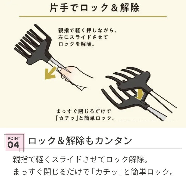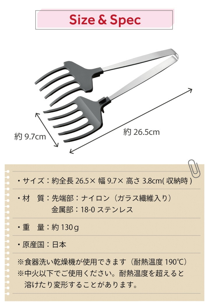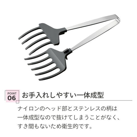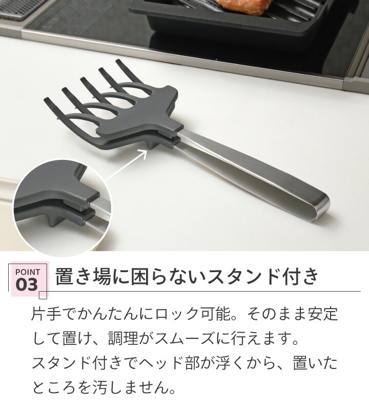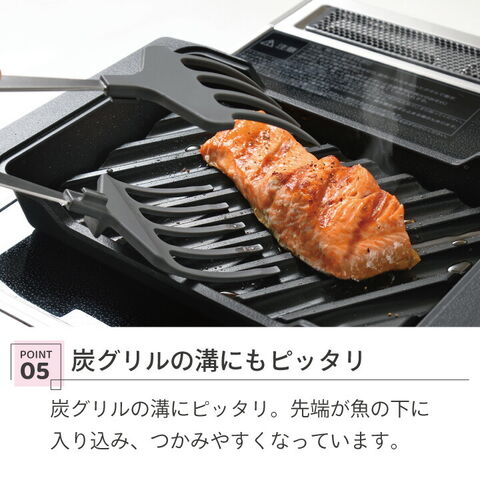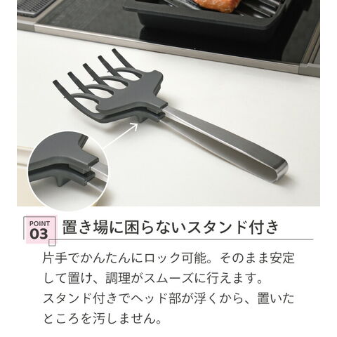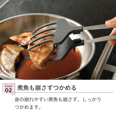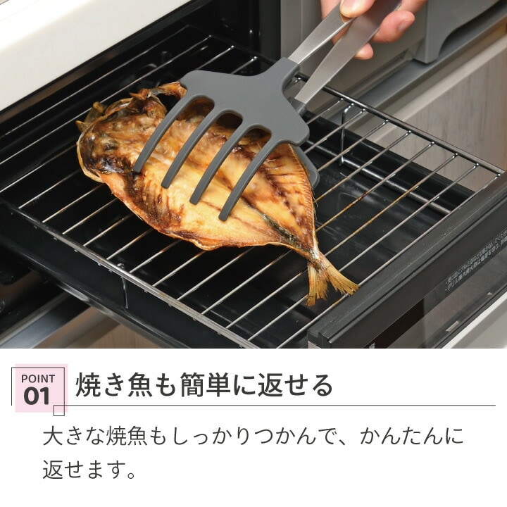 ●焼魚も煮魚も、崩さずしっかりキャッチ! ●大きな焼き魚も簡単に返せます。 ●崩れやすい煮魚も崩さずしっかり掴めて、盛り付けもキレイに。 ●置いた際、先端が浮くようにスタンドが付いているので 作業台を汚さず衛生的です。 ●片手で簡単にロック可能。収納時もかさばりません。 ●グリルの溝にもピッタリ。ヘッド部が魚の下に入り込みしっかり掴みやすい。 ●ヘッド部と柄の部分は一体成型なので、隙間がなく衛生的! 抜けてしまうこともありません。 ●食器洗い乾燥機の使用もOK! |