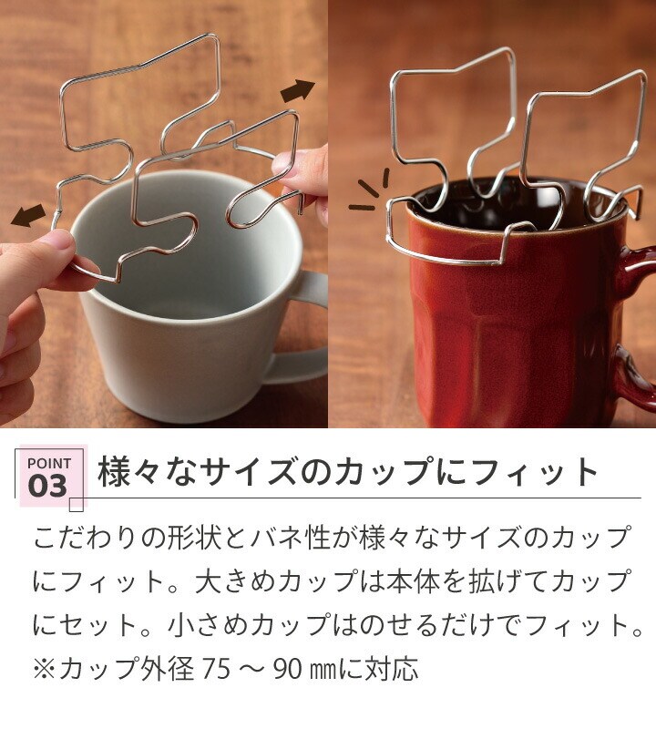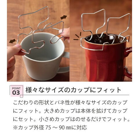 コーヒーバッグ ドリップバッグ 氷を入れられる アイスコーヒー ドリップ ドリッパー コーヒードリッパー バネ ステンレス サビに強い 錆に強い 食洗機 食洗器 食洗器対応 食器洗い機 食器乾燥機 耐熱 カップ外径 75~90mm 75ミリ 80ミリ 90ミリ 7.5cm 8cm 9cm カップ コップ コーヒーカップ 引っ掛け 浮かせる 浸からない コーヒー好き トレー 皿 置き場所 アウトドア キャンプ レジャー たき火 登山 一人暮らし 新社会人 単身赴任 主婦 主夫 大人 こども おかず 朝ご飯 朝食 昼ごはん 昼食 晩ご飯 夕食 和食 洋食 自炊 毎日 デイリー キッチン 台所 キッチングッズ 小物 キッチン小物 調理小道具 雑貨 キッチン雑貨 人気 お役立ち 便利 便利グッズ アイデア 国産 Made In Japan madeinjapan aux AUX