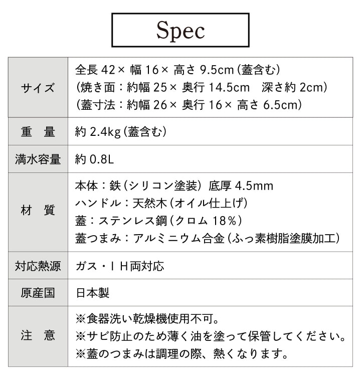 ※通常より厚く重たい鉄板を加工する為、材料表面に線のような跡が 入りますが使用上には問題ありません。 ※調理後の鉄板は大変熱くなります。テーブル等に置く際は大きくて 厚めの鍋敷きをご用意ください。 |