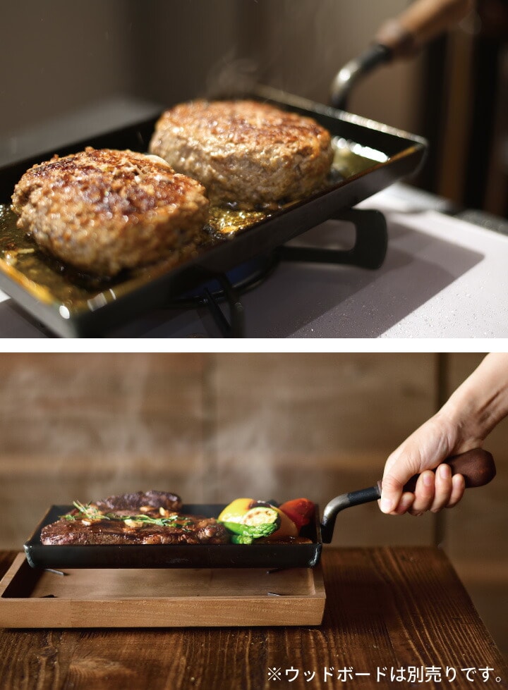 ●ポンドステーキがぴったり入る大きさです。蓋付きで、お肉以外にも 海鮮や蒸し野菜も楽しめます。 ●一般的なフライパンと比べて約3倍もの厚みを持つ4.5mmの極厚鉄板は、 熱をたっぷり蓄えることができます。じっくりと食材を焼き上げるので、 食材本来の旨みを引き出します。 ●大人の鉄板は厚みがあるため、広く全体が温まり、緩やかに食材の内部に 熱を伝えます。表面は程よく焼け、中は熱が均等に入ります。 ●大人の鉄板でつくるマルディグラ和知シェフの大人レシピ付き。(5レシピ) ●使い込むほどに味わいが増していく天然木仕様のハンドル。 傷んだ場合は簡単に交換でき、一生モノの道具として使えます。 |