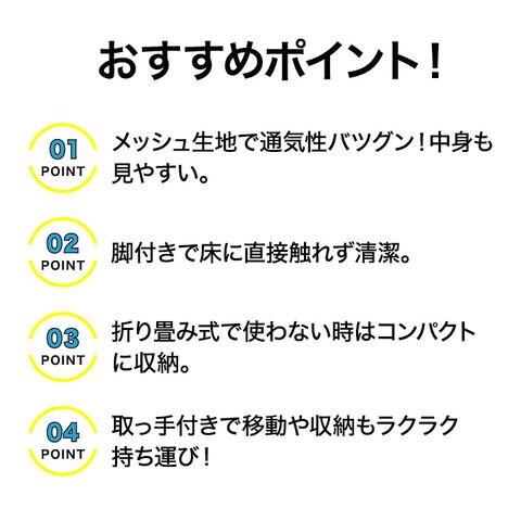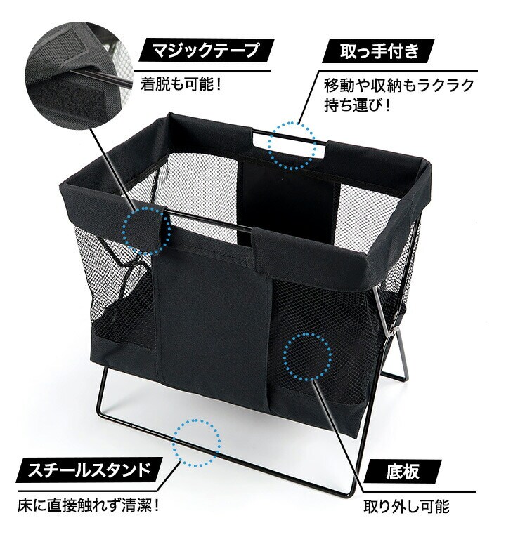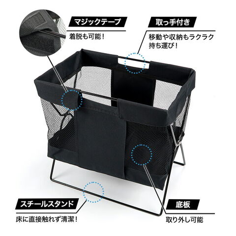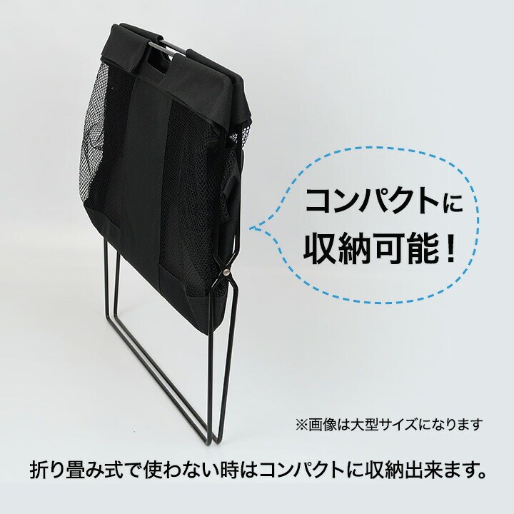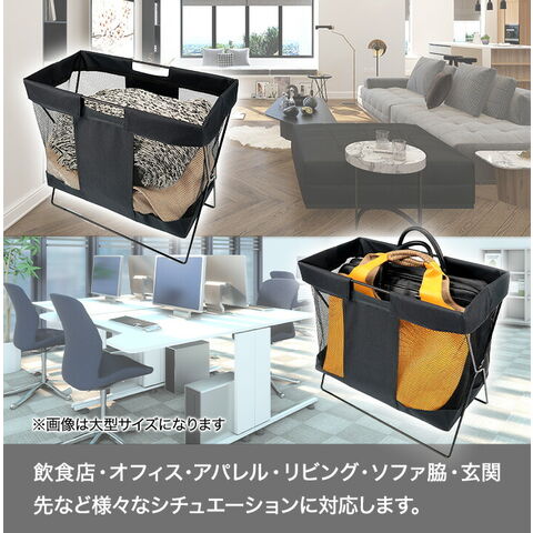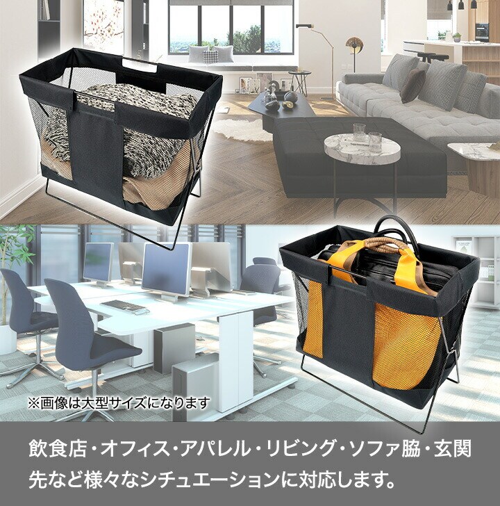 ●飲食店でよく見る手荷物入れ ●メッシュ生地で、中身が見やすく通気性もバツグンです。 ●脚付きで、床に直接触れず清潔に収納できます。 ●折り畳み式で使わない時はコンパクトに収納可能。 ●置きやすい小型サイズ |