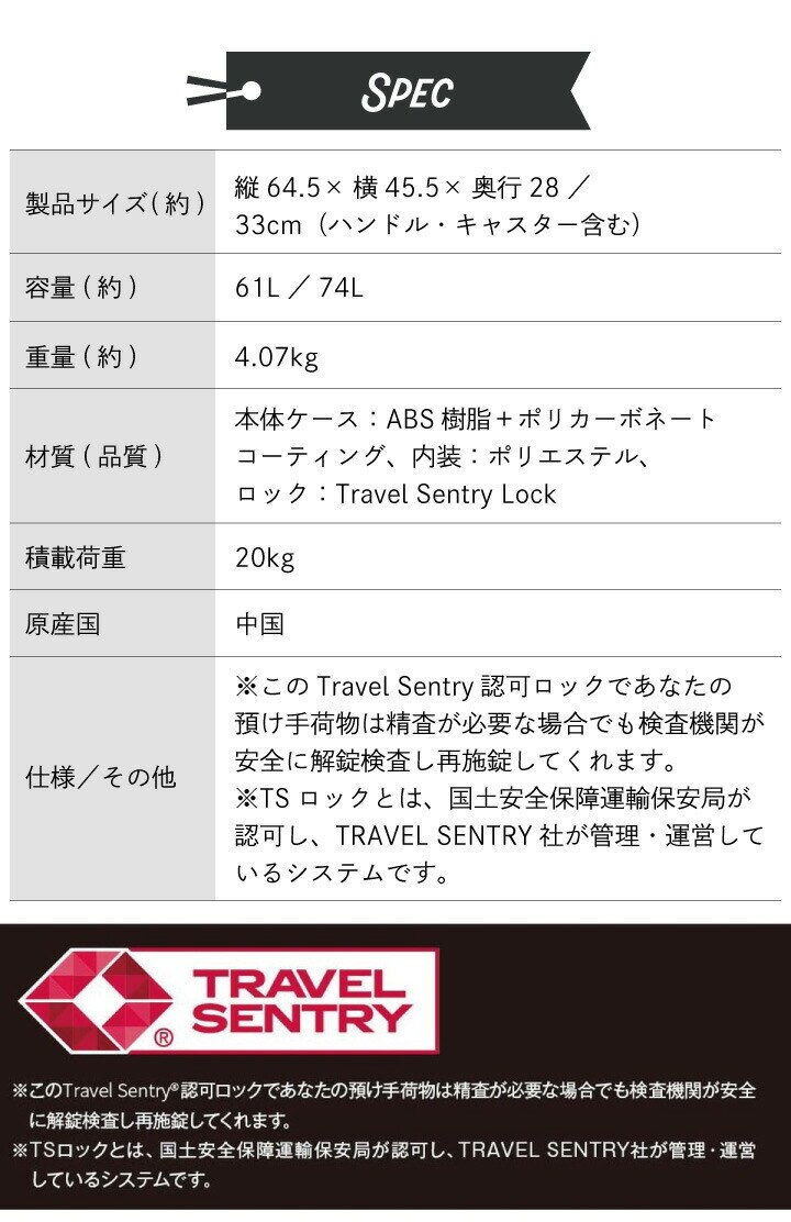 スーツケース キャリーケース キャリーバッグ キャリー 旅行 海外旅行 国内旅行 お出かけ 出張 ビジネス 帰省 普段使い 荷物 大荷物 持ち運び パッキング 大容量 容量アップ M Mサイズ 61L 61リットル 61L 61リットル 74L 74リットル 74L 74リットル 軽量 軽い 超軽量 4kg 4キロ 4Kg 4キロ ロック付き ロック機能 ロック TSロック Travel Sentry TRAVEL SENTRY 認可ロック 世界 世界基準 国際基準 飛行機 国際線 国内線 新幹線 電車 バス ダブルファスナー ファスナータイプ 傷 キズ 汚れ よごれ 強い ポリカーボネート ポリカーボネートコーティング ハードタイプ 丈夫 耐久性 保護 360度 回転自在 走行 安定 ホイール ダブルホイール タイヤ 4輪 4輪 伸縮キャリーバー キャリーバー 持ち手 取っ手 調節可能 調節 高さ調節 3段階 3段階 ワンタッチ クロスベルト ベルト 仕切り 仕切りボード フック付き仕切りボード フック 掛ける 掛けられる 外せる 取り外し お土産 おみやげ スペース 確保 4泊 4泊 5泊 5泊 6泊 6泊 3~4日 4~5日 5~6日 家族 まとめて オリーブ 緑 濃い緑 モスグリーン カーキ 茶色 黄色 黄土色 ブラック 黒 シルバー 銀 アースカラー シンプル かっこいい カッコイイ スタイリッシュ おしゃれ オシャレ 飽きない デザイン 送料無料 キャプテンスタッグ CAPTAIN STAG パール金属