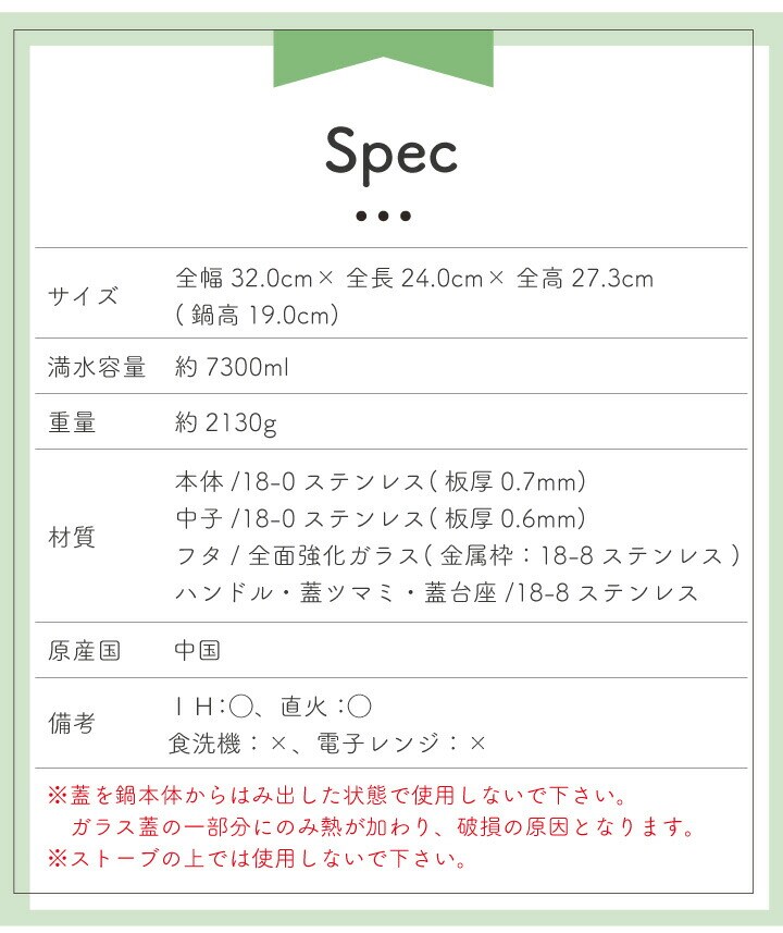 本体/18-0ステンレス(板厚0.7mm) 中子18-0ステンレス(板厚0.6mm) フタ/全面強化ガラス(金属枠 18-8ステンレス) ハンドル・蓋ツマミ・蓋台座/18-8ステンレス |