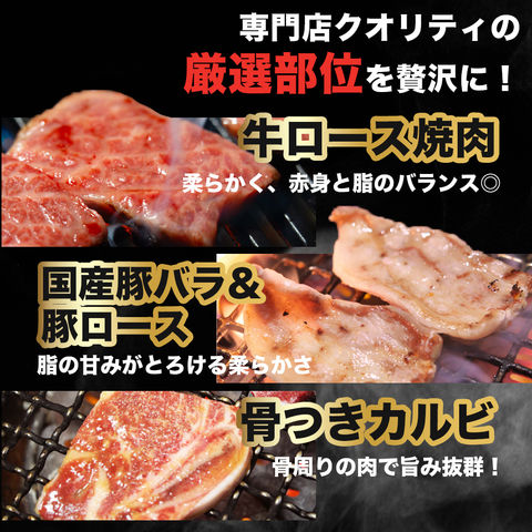 | 内容 | 牛ロース焼肉用、骨付きカルビ、テッチャン、ハラミ、牛タン、上ミノ、国産豚ロース、国産豚バラ、万能タレ(醤油、砂糖、みりん、酒、ニンニク、しょうが、豆板醤、塩、胡椒(一部に大豆・小麦を含む)) |