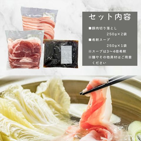 | 内容量 | 沖縄県産豚肉切り落とし250g×2袋(500g)、和風醤油スープ250g×1袋 ※麺やその他具材は含まれておりません |