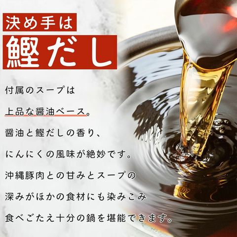 | 備考 | 100%沖縄県産豚肉:部位はお任せ※脂が多い部分を含むことがあります。 スライス加工もすべて沖縄県内で行っております。 鰹だしと醤油の旨みに、にんにく香る和風スープは3〜4倍希釈でたっぷり使えて便利。 お好みで濃さを調整てお使いください。 |