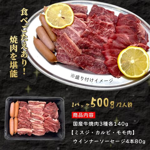 焼肉セット 国産牛 3種 食べ比べ 500g (約2-3人前)【 牛カルビ ミスジ 牛もも/ウインナー 】 焼肉盛り合わせ/BBQ バーベキュー キャンプ 冷凍 牛肉