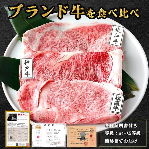 | 商品説明 | ◆松阪牛:美しい霜降りと食べ応えある濃い旨みが特徴で、口に含むとじゅわっと広がる肉汁と上質な肉質がたまりません。 ◆神戸牛:繊細で豊かな霜降りと上品な肉の甘みが特徴で、とろけるような口溶けはまさに絶品です。 ◆近江牛:霜降りがほかの2種より少なく赤身のあっさりとした旨みと柔らかい食感が特徴です。 |