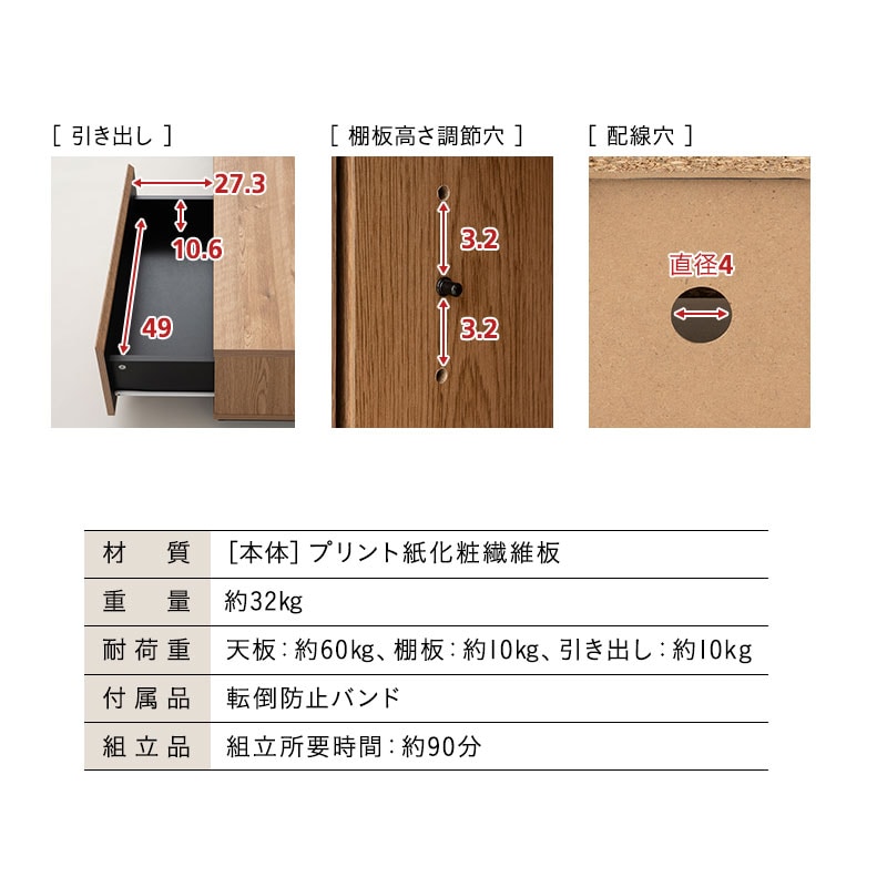 | 耐荷重 | 天板:約60kg 棚板:約10kg 引き出し収納部:約10kg |