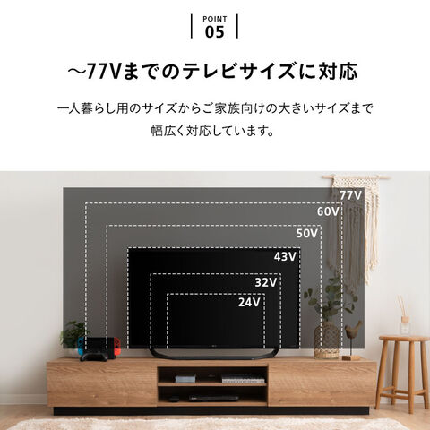| 対応目安サイズ | 24~77インチ (24V/32V/37V/40V/42V/43V/45V/48V/49V/50V/55V/58V/60V/65V/70V/75V/77V) ※テレビの脚の形や幅にご注意ください。 |