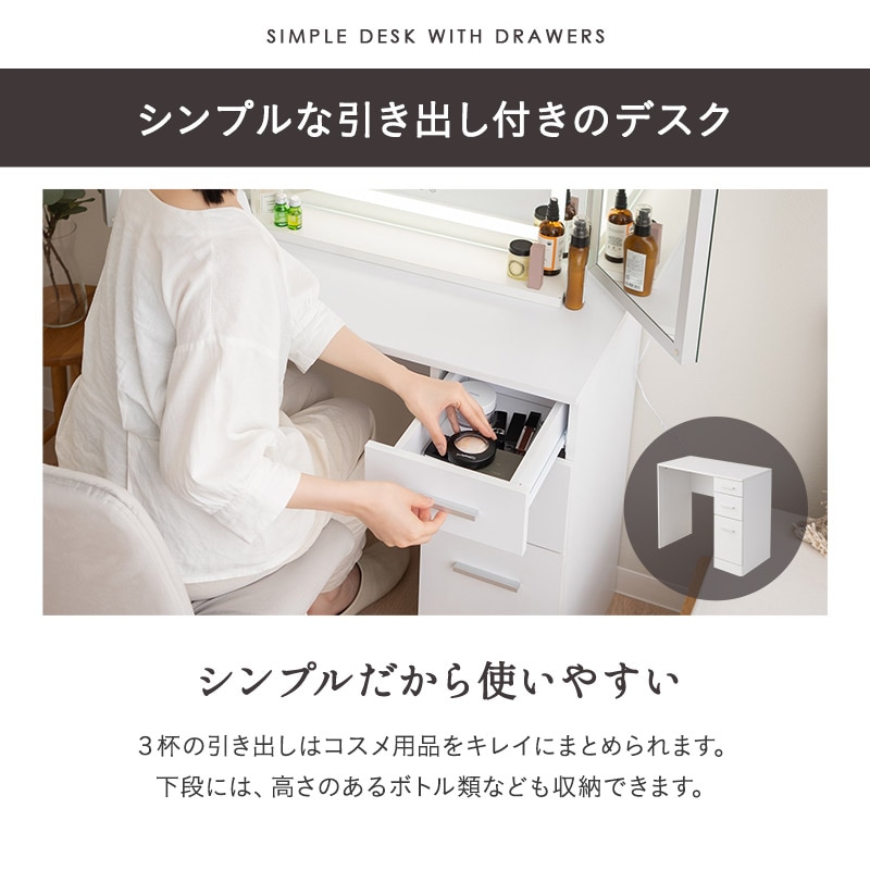 LEDライト付き 三面鏡 ドレッサー 2点 セット 鏡台 幅80cm 木製 ホワイト 白 収納 コンパクト 省スペース 化粧台 デスク テーブル 机 女優ミラー 鏡 ミラー スタンド 卓上 化粧 メイク 照明 リモート パソコン 北欧 おしゃれ かわいい 新生活 ギフト 送料無料 エムール
