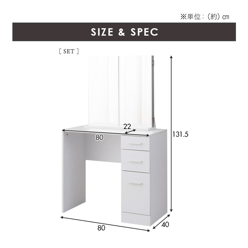 | サイズ | 全体:約幅80×奥行40×高さ131.5cm デスク:約幅80×奥行40×高さ70cm 三面鏡(閉じた状態):約幅60×奥行18×高さ61.5cm 三面鏡(開いた状態):約幅120×奥行18×高さ61.5cm |