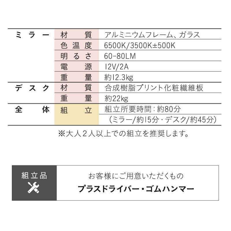 | 組立所要時間 | デスク:約45分 三面鏡:約15分 ※プラスドライバー・ゴムハンマーをご用意ください。 ※大人2人以上での組立を推奨。 |