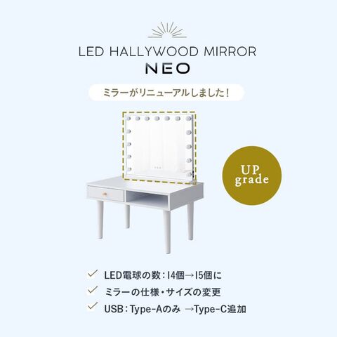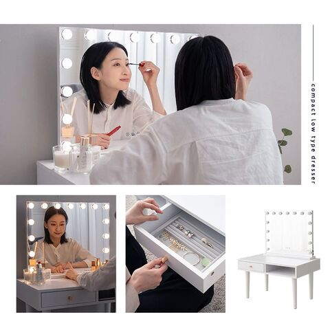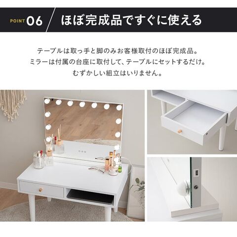 LEDライト付き ドレッサー 2点セット 鏡台 幅70cm ロータイプ デスク テーブル 机 ハリウッドミラー 女優ミラー 木製 ホワイト 白 収納 コンパクト 充電 パソコンデスク 化粧台 メイク 卓上 鏡 ミラー 照明 リモート 北欧 おしゃれ かわいい 新生活 送料無料 エムール