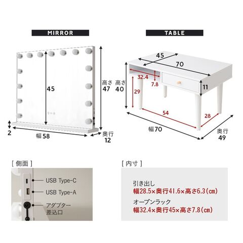 | サイズ | 全体:約幅70×奥行49×高さ97cm テーブル:約幅70×奥行49×高さ40cm ミラー:約幅58×奥行5×高さ45cm (台座を取り付けた場合:約幅58×奥行12×高さ47cm) |