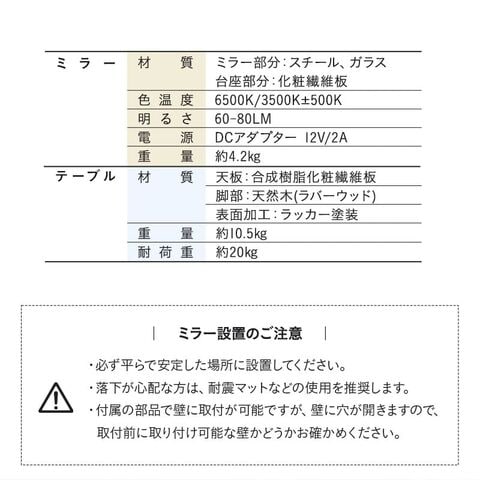 | 素材 | テーブル(天板):合成樹脂化粧繊維板 ラッカー塗装 テーブル(脚):天然木(ラバーウッド) ミラー:スチール、ガラス 台座:化粧繊維板 |