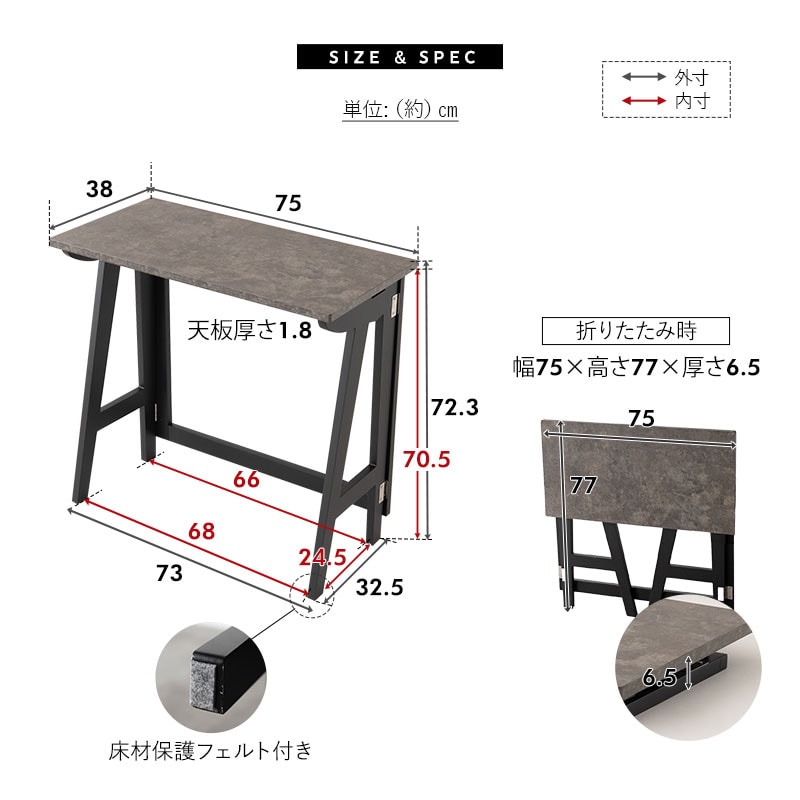 | サイズ | 使用時:約幅75×奥行38×高さ72.3cm 収納時:約幅75×奥行6.5×高さ77 天板(折りたたみ部分):約幅75×奥行38×高さ72.3cm |
