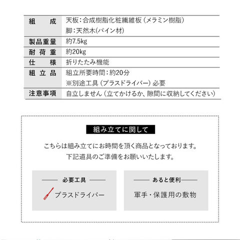 | 素材 | 天板:合成樹脂化粧繊維板(メラミン) 脚:天然木(パイン材) |