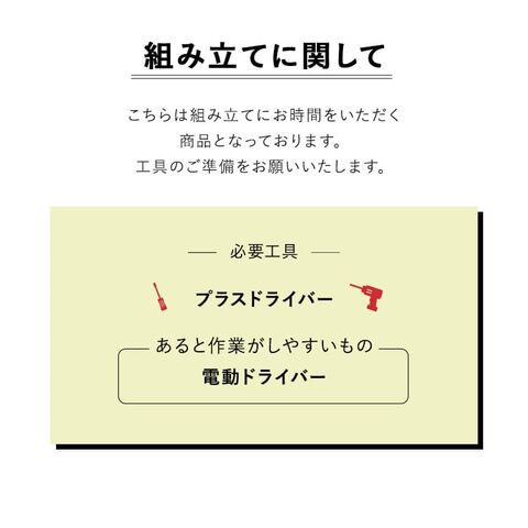 | 組立所要時間 | 大人2人で約60分 ※プラスドライバーをご用意ください。 ※組立時、電動ドライバー・軍手・敷物があると便利です。 ※大人2人以上での組み立てを推奨しております。 |