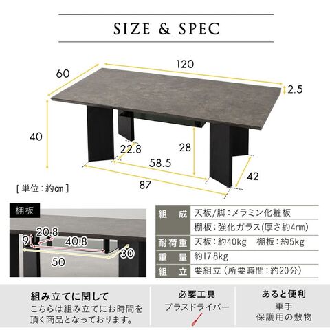 | サイズ | 全体:約幅120×奥行60×高さ40cm 脚部:約幅72×奥行42cm |