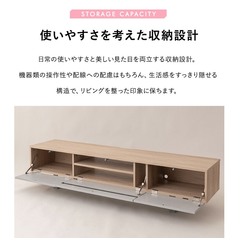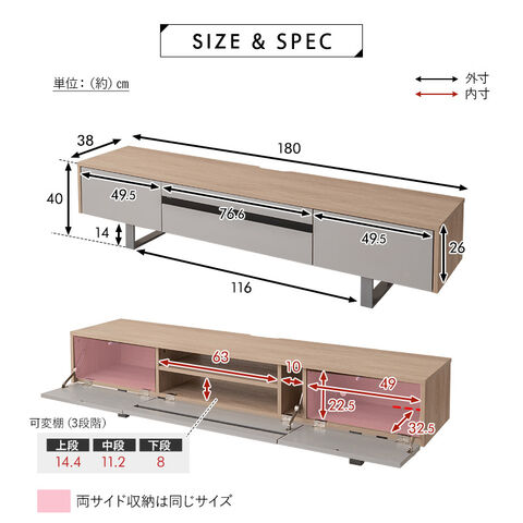 | サイズ | 全体:約幅180×奥行38×高さ40cm 中央収納(内寸):約幅63×奥行32.5×高さ22.5cm 左右収納(内寸):約幅49×奥行32.5×高さ22.5cm |