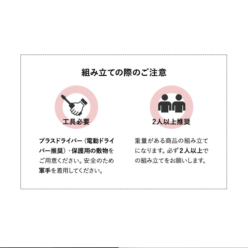 | 組立所要時間 | 大人2人で約60分 ※プラスドライバーをご用意ください。 ※組立時、電動ドライバー・軍手・敷物があると便利です。 ※大人2人以上での組み立てを推奨 |